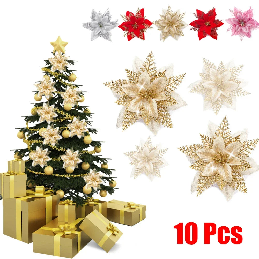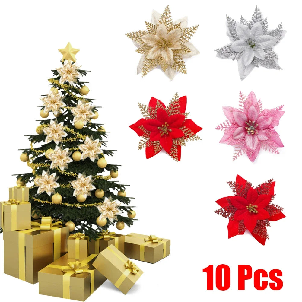 10pcs Christmas Large Poinsettia Glitter Flower Tree Hanging Party Xmas Decor For Home Xmas Navidad New Year 2024